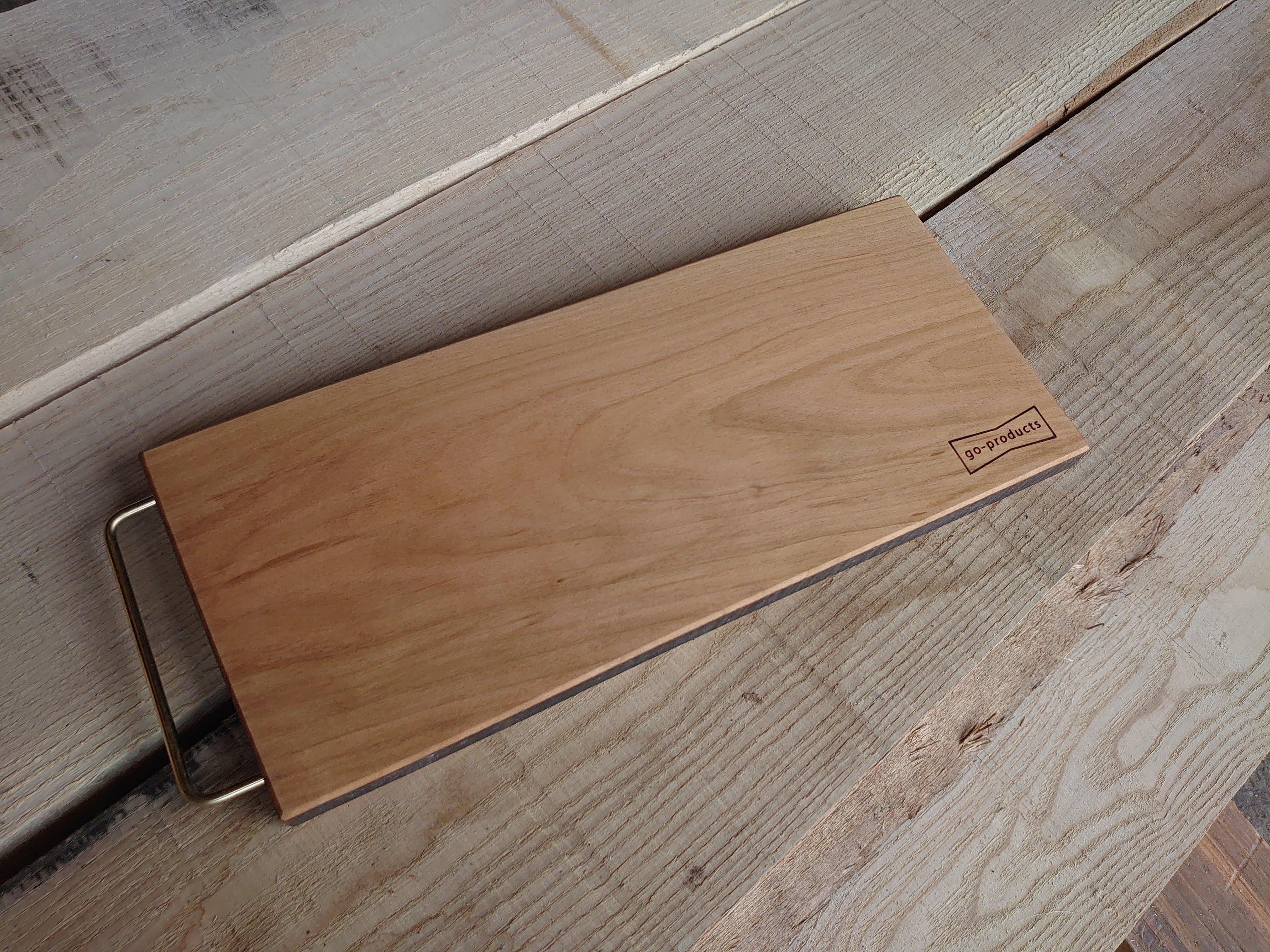 山桜の木目にサイドは炭クロに染め、真鍮取っ手をつけて品があるボードに磨き上げました。。